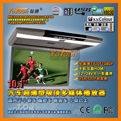 10.1 inch Super Slim HD Flip Down Monitor System:PAL/NTSC Display Mode:16:9 wide view screen With OSD menu,Multillingual supported Compatible with VCD/MP3/CD/CD-RW/....etc Dual IR/FM transmitter(optional) USB port and SD card slot(optional) Video:2 way video inputs Full function with Remote control Power supply:DC12V 3 color available:Beige ,Black,Grey. |