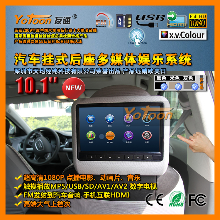 10.1英寸高清数字液晶触摸屏。 分辨率:1920*1080pix 支持1080P高清 支持MP3、WMA、APE等多种音频格式。 支持DVD、CD、VCD、HVCD、MP4、AVI、DIVX等多种视频播放格式。可支持1080P视频格式播放。 电源:DC12V 显示尺寸:10.1英寸 显示模式:16:9宽屏幕 系统:PAL / NTSC 两个音频视频输入 IR耳机和FM发射到汽车音响 iPhone / iPad的充电 iPhone/ipad视频输入 支持SD卡 手机互联HDMI输入 Features: Movie player: Support Full HD 1920 * 1080 video decoding, at the same time also supports MP4, MPG, RM, RMVB, AVI, MPEG, VOB; DIVX and other video format playback; Music player: Support MP3, WMA, AC3, EAC3, M4A and other audio formats; Photo playback: Support JPEG,BMP,PNG and other file formats browsing ; E-Book: Support TXT format reading; Support CMMB digital signal reception and playback (optional); Support analog TV signal reception and playback (optional); Support for SD card and USB port reading; 14 languages for selection.