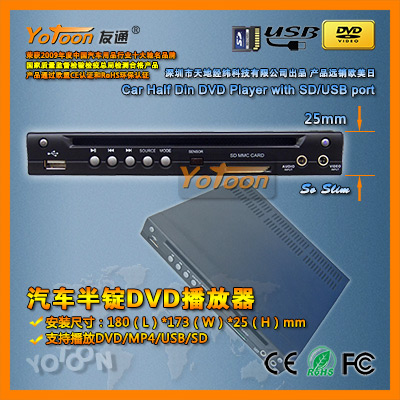 半DIN车载DVD播放器 ● 半Din 180 ( L ) *173 ( W ) *25 ( H ) mm ● DVD/VCD/CD/CD-R/CD-RW/MP3兼容 ● 超薄型车载DVD槽机制 ● 数字机电抗休克电除尘器记忆 ● 内置杜比数字解码器 ● 最后位置记忆 ● OSD (屏幕显示) ● 的NTSC / PAL可选 ● 巨型尺寸液晶显示器 ● 全功能红外遥控 ● 1的RCA视频输出 ● 1光输出 ● 1同轴输出 |