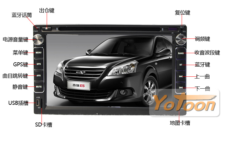 友通Yotoon奇瑞E5专车GPS导航仪,是中国汽车用品十大驰名品牌之一,获得欧盟CE认证,奇瑞E5专用DVD导航价格优惠,是车厂、4S、经销商和客户的最佳选择。奇瑞E5导航仪改装后与原车完美匹配,奇瑞E5车加装奇瑞E5专用导航仪后,导航仪内置蓝牙、收音机、DVD、倒车视频输入等功能。