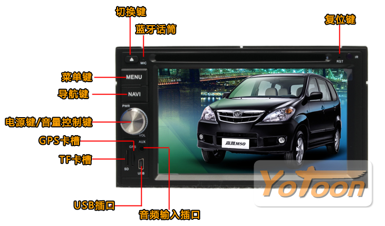 ·友通Yotoon车载影音导航系列产品采用全新16:9高清晰度真彩液晶显示屏,800*3(RGB)*480。