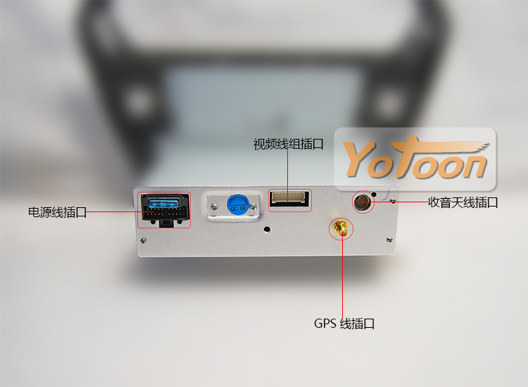 ·友通Yotoon车载影音导航系列产品内置2路视频输出,2路视频输入(一路为视频输入,一路为后视摄像头信号输入)接口。