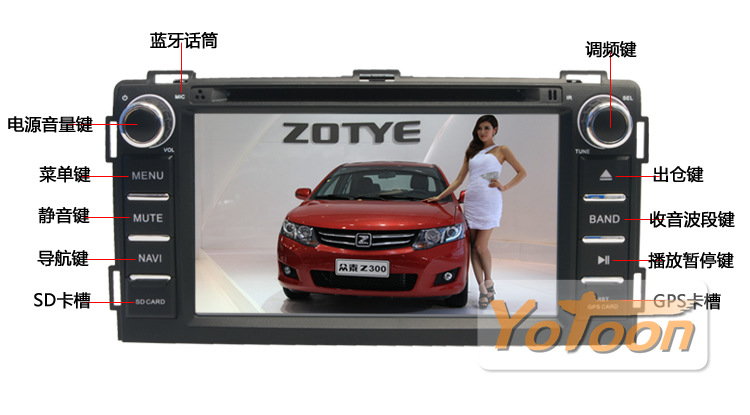 ·友通Yotoon车载影音导航系列产品采用全新16:9高清晰度真彩液晶显示屏,800*3(RGB)*480。