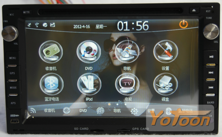 友通YOTOON系列影音导航产品全面支持USB/SD功能。全触摸控制功能,实现扫描播放、重复播放、随机播放;支持MP3/WMA/AVI/DAT/VOB多种音频及视频格式;支持JPG柯达相册、幻灯片自动播放。
